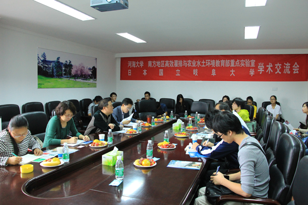 “南方地区高效灌排与农业水土环境教育部重点实验室于2014年9月19日在hg8868体育官网水电馆420室与日本国立岐阜大学进行了学术交流研讨。参加会议的有日本国立岐阜大学李富生教授、hg8868体育官网hg8868体育官网徐俊增教授、张洁副教授、廖林仙老师,以及来自日本国立岐阜大学、南京农业大学、hg8868体育官网的20多名博士、硕士研究生代表。会议由教育部重点实验室主任邵孝侯教授主持。