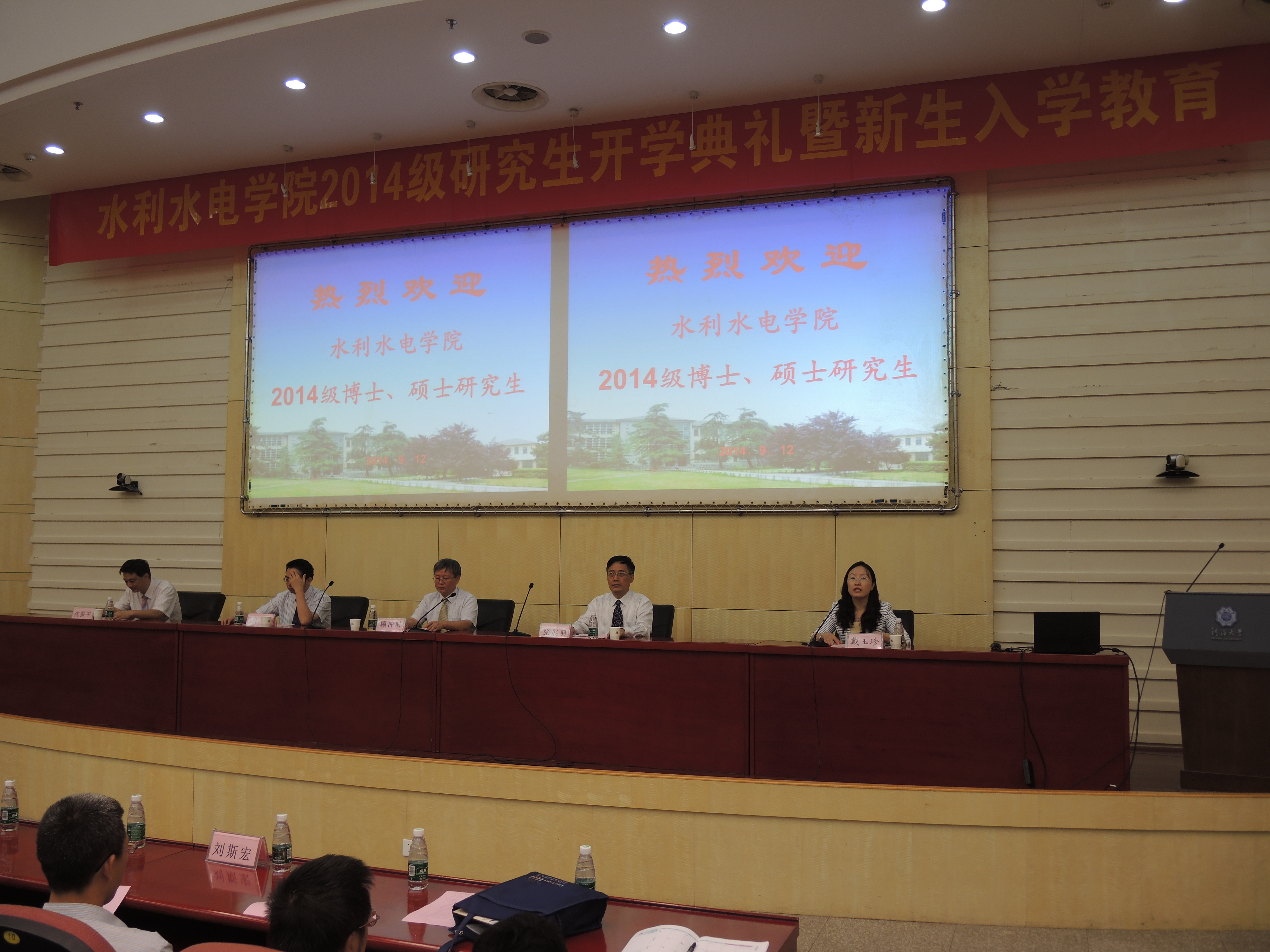 2014年9月12日上午8:30,hg8868体育官网在闻天馆108隆重举行2014级博士、硕士研究生开学典礼暨新生入学教育。hg8868体育官网院长顾冲时教授,党委书记张展羽教授,副院长肖洋教授、沈振中教授,及水利水电工程系主任蔡付林教授,农业水利工程系主任朱成立副教授,水工结构研究所副所长苏怀智教授,水电研究所副所长周建旭教授,水力学及河流动力学研究所副所长杨校礼老师,农业水土工程研究所所长郭相平教授,农业环境研究所所长邵孝侯教授等出席了典礼,典礼由hg8868体育官网党委副书记戴玉珍老师主持。参加典礼的还有hg8868体育官网研究生教学秘书周昶老师、研究生辅导员赵志涵老师以及辅导员助管慕子煜老师。