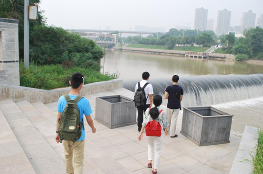 随后,在刘磊工程师的带领下,我们进入了浐灞生态区。我们着重调研了该生态区的具体情况及其水利设施分布。浐灞生态化提防36公里,新增绿地6700亩,水面8900亩,浐灞生态区的建立使西安市的西北郊排水问题以及水质得到改善,还形成城市生态景观长廊,改善了城市综合环境品质,也因此成为西安外围一道亮丽的风景线。沿河而上,刘磊工程师还向队员们介绍了迎面的橡胶坝的结构原理、工作方法。
