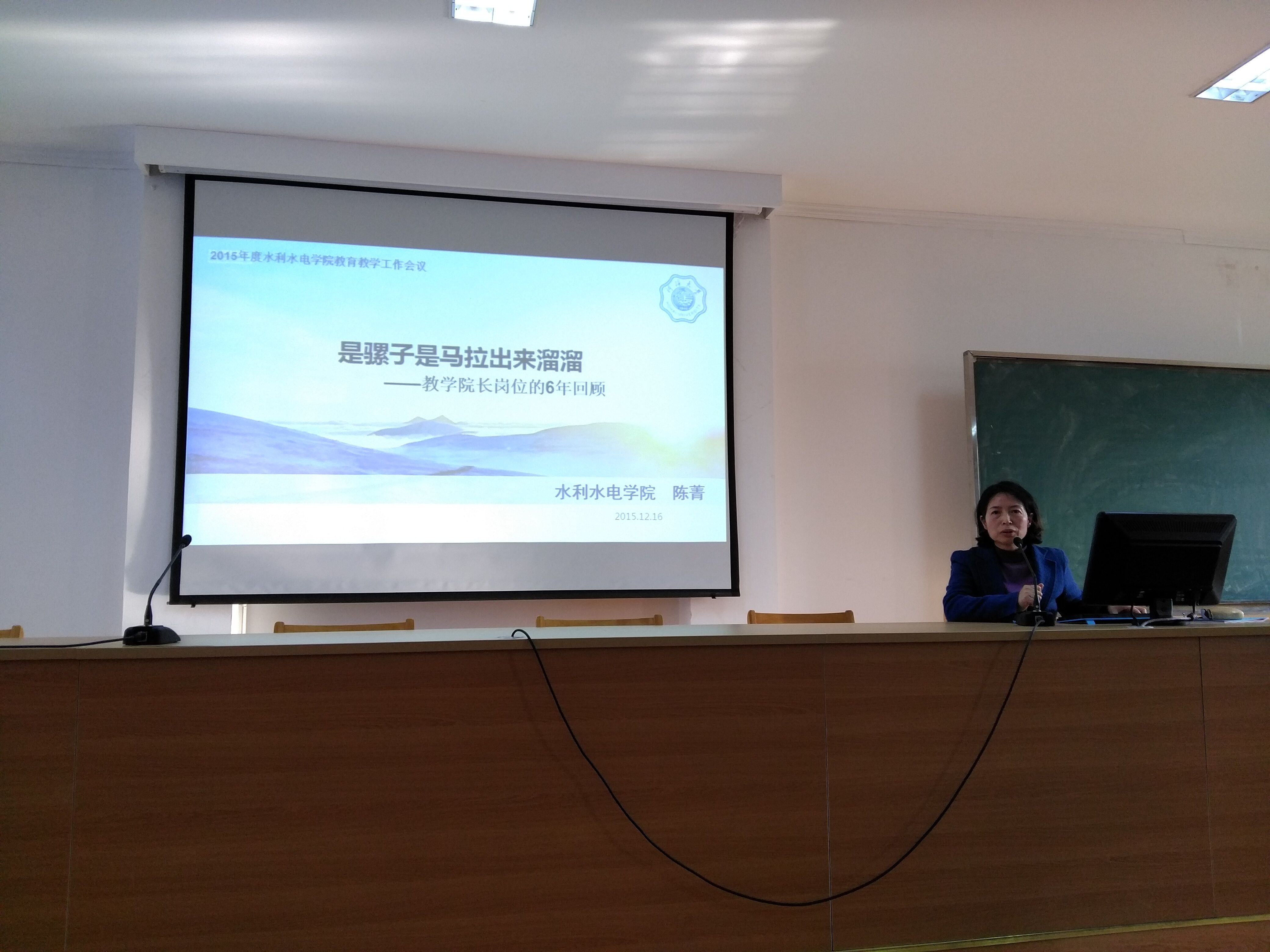 12月16日下午,学院于水电馆401召开“2015年度教育教学及研究生工作会议”,会议由张展羽书记主持。本次会议特邀教务处胡明副处长到场指导,参加会议的还有学院二级机构正副主任、所长,本科生和研究生教学、教育管理人员,青年教授代表,核心课程负责人,各系所代表,实验中心教师代表,教学秘书,辅导员及优秀学生代表等。为紧密契合今年学校教育教学工作重点,学院此次会议的主题为“双一流•国际化”。