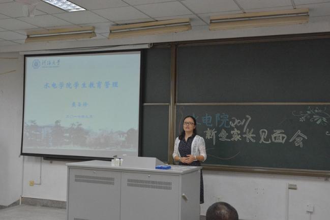 戴玉珍副书记从学生管理、大学学习与自我管理等方面向家长们介绍了我院本科生教育教学的相关制度和人才培养管理模式。她指出,大学生活已经开始,梦想在这里发芽,希望家校合作、齐心协力,努力把水电院的同学们培养成为家庭依靠、学校骄傲、社会需要的优秀人才。