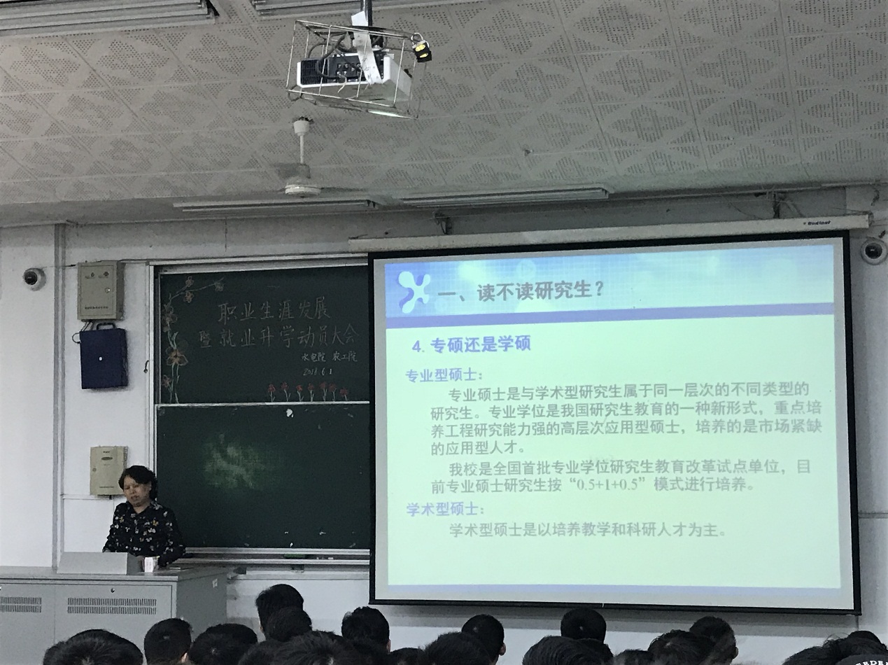 6月1日,水电院、农工院2015级全体同学于科学会堂101召开职业生涯发展暨就业升学动员大会。水电院方国华副院长、农工院陈菁副院长、水电院戴玉珍副书记为同学们做了就业与升学的讲座。