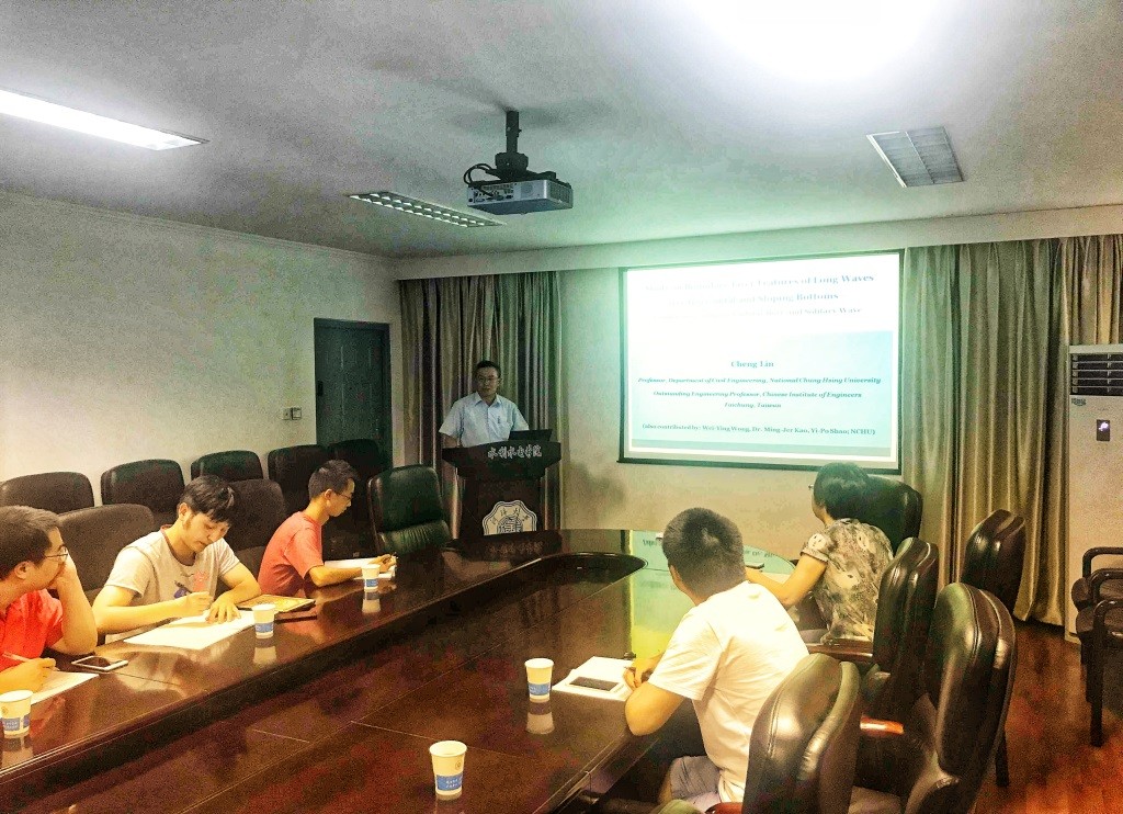 2018年6月27日下午3点,台湾中兴大学林呈教授应邀为hg8868体育官网hg8868体育官网师生作了题为“Flow characteristics of undular bores propagating over horizontal and sloping bottoms”的学术报告。林呈教授长期从事海洋动力结构物理模拟实验研究。现担任海洋科学与技术国际期刊(Journal of Marine Science and Technology)编辑、水动力学国际研讨会执行委员、亚洲地区可视化国际研讨会执行委员、美国土木工程学会工程力学研究所紊流工作委员会委员、中国土木水利工程学会理事、中国工程师学会中区分会理事、台湾海洋工程学会理事等职务,有极高的学术造诣。报告由王玲玲老师主持,学校相关专业老师与研究生共四十余人参加了报告会。