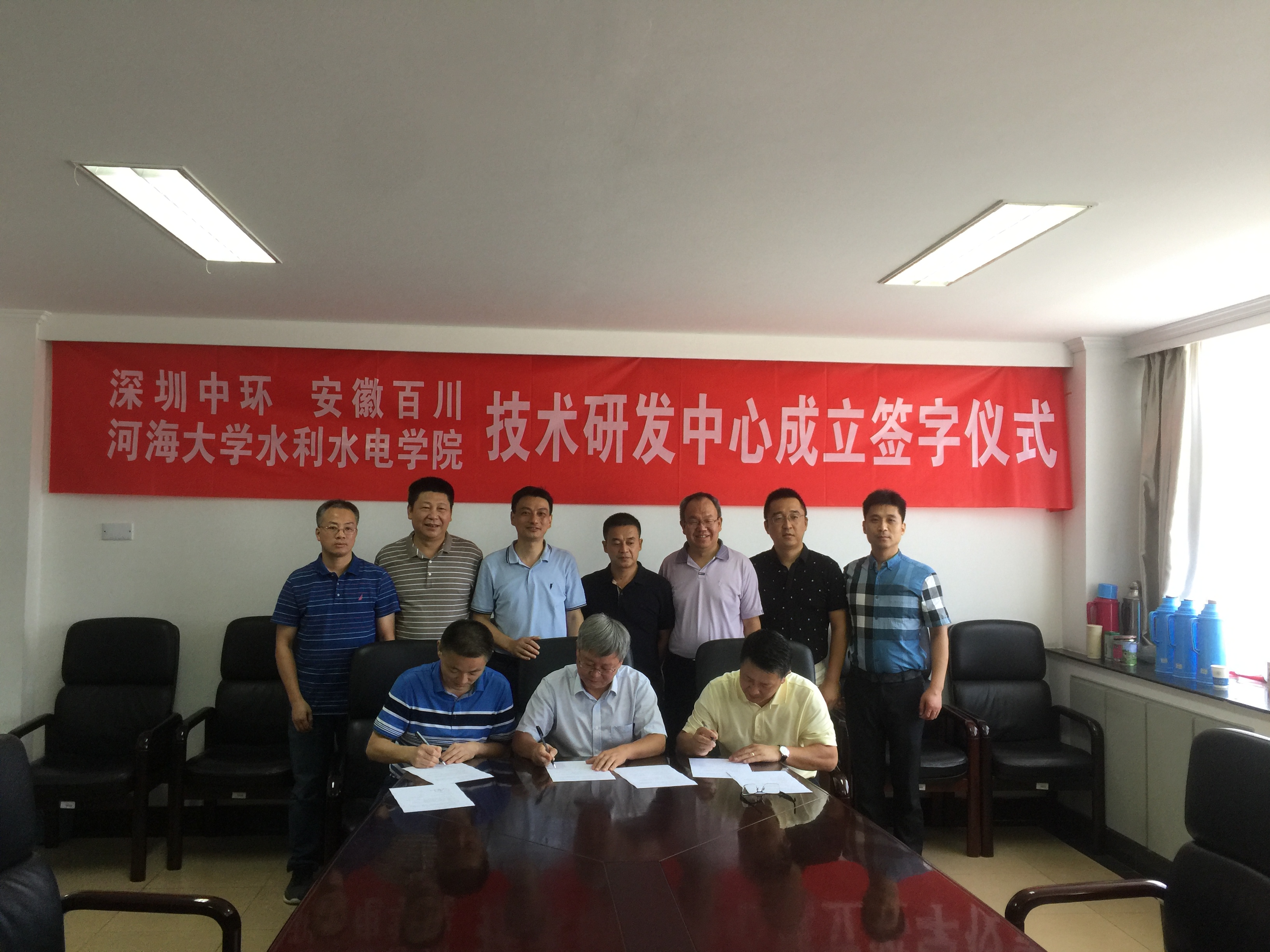 7月12日上午,深圳前海中环科技投资发展有限公司、安徽百川水利科技有限公司访问了我院,并与我院院长顾冲时教授、副院长沈振中教授等就产学研合作展开了交流探讨,经过三方友好协商,达成一致,于当日上午签署了战略合作协议。协议旨在发挥各自优势,促进产-学-研的深入合作,推进高校的科研成果的转化,切实将最新的研究成果应用到实际生产活动中,同时为企业输送优秀的水利科技人才,为双方发展提供智力和技术支持。水工所副所长苏怀智教授、水力学所所长傅宗甫教授、实验中心主任田正宏教授参加了协议签署仪式。(王慧慧)