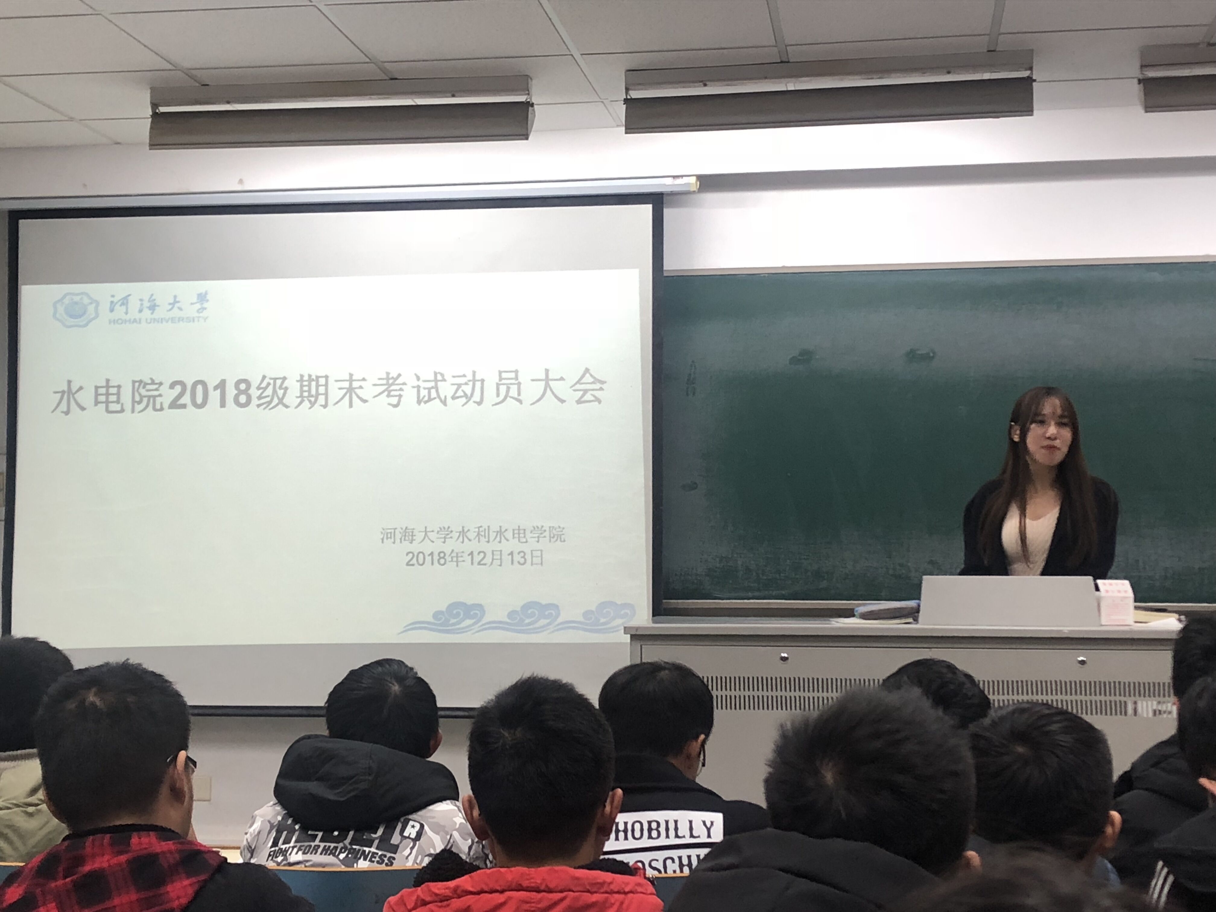 为贯彻学校教育教学工作会议精神,进一步加强我院学生的学风建设和诚信教育,紧抓不懈,齐头并进,我院于12月13日举办期末考试动员大会,大会由18级辅导员姜帆老师主持,18级全体新生同学参加。