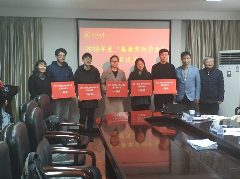 12月17日,“基康奖助学金”捐赠及颁奖仪式在我院水电馆420举行。基康公司副董事长沈省三,hg8868体育官网合作办、校友办、基金办主任黄林楠,水电学院院长顾冲时,水电学院党委副书记戴玉珍出席会议,学院15、16级辅导员以及2017、2018年度获奖同学参加仪式。