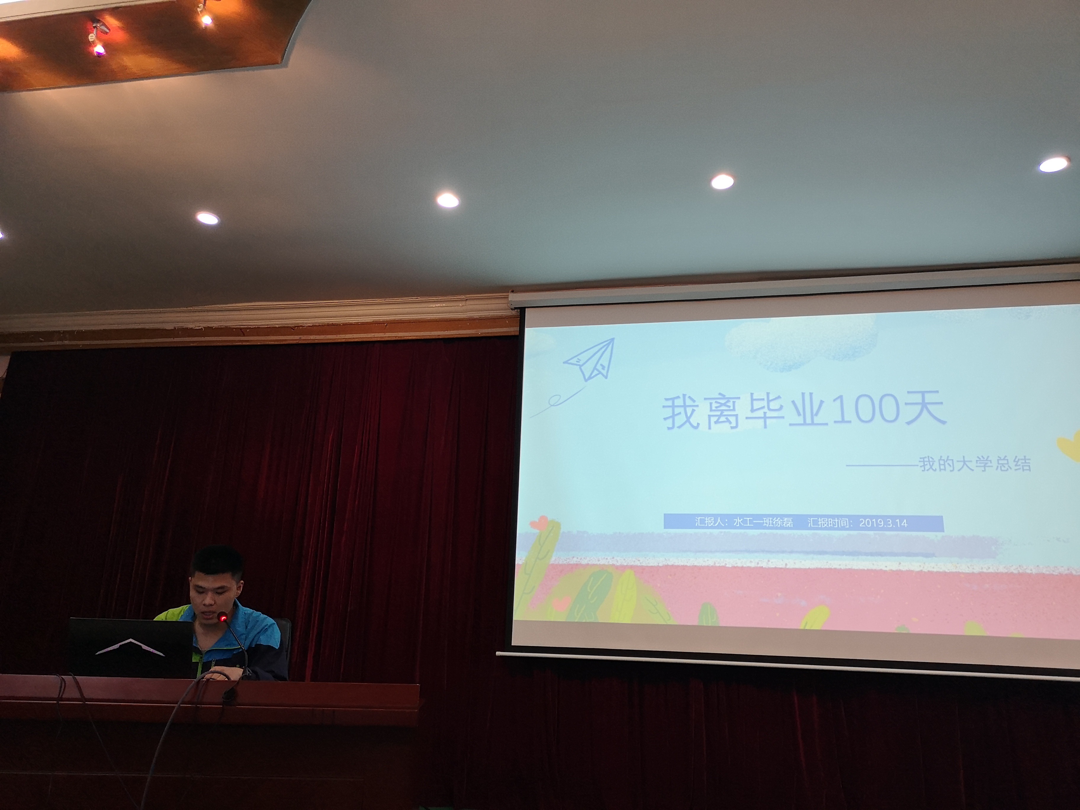 为切实有效开展2015级生涯教育,做好学生毕业心态调整,迎接毕业季到来,我院于3月14日举办2015级“我离毕业100天”——我的大学总结交流会。旨在引导学生总结大学四年收获,有针对性的制定下一阶段目标,2015级辅导员笪步源和年级全体本科生参加。