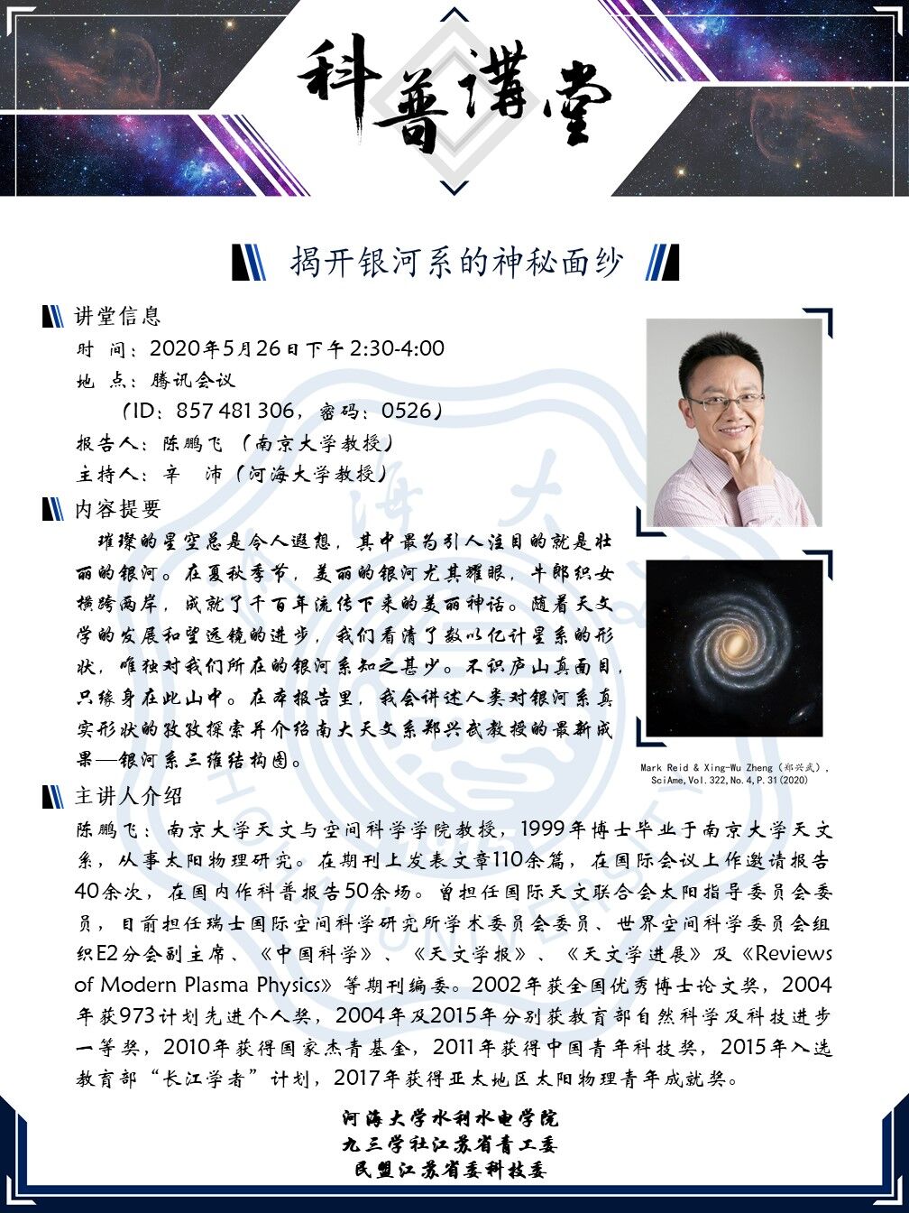 报告人简介:陈鹏飞,南京大学天文与空间科学学院教授,1999年博士毕业于南京大学天文系,从事太阳物理研究。在期刊上发表文章110余篇,在国际会议上作邀请报告40余次,在国内作科普报告50余场。曾担任国际天文联合会太阳指导委员会委员,目前担任瑞士国际空间科学研究所学术委员会委员、世界空间科学委员会组织E2分会副主席、《中国科学》、《天文学报》、《天文学进展》及《Reviews of Modern Plasma Physics》等期刊编委。2002年获全国优秀博士论文奖,2004年获973计划先进个人奖,2004年及2015年分别获教育部自然科学及科技进步一等奖,2010年获得国家杰青基金,2011年获得中国青年科技奖,2017年获得亚太地区太阳物理青年成就奖。