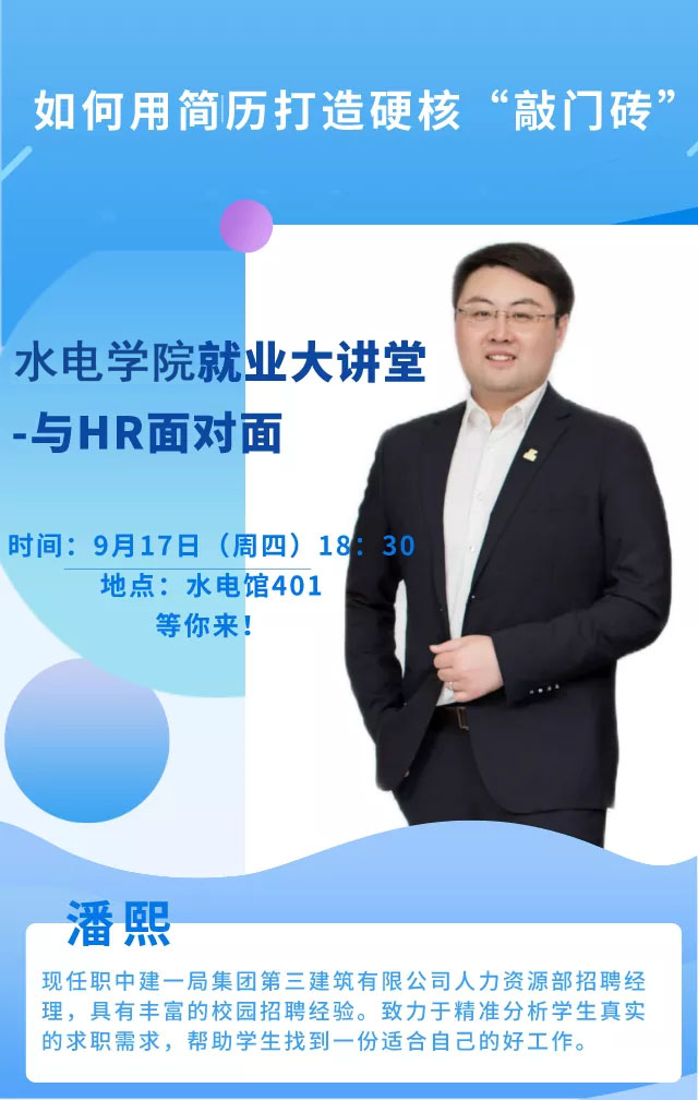 9月17日,为提升我院毕业生的就业竞争力,帮助毕业生了解简历制作的知识和技巧,学院举办了“水电就业大讲堂”之与HR面对面系列讲座,邀请中建一局集团第三建筑有限公司人力资源部招聘经理潘熙,以《如何用简历打造硬核“敲门砖”》为题,为毕业生开展了一场既生动又实用的培训。党委副书记王方主持讲座。