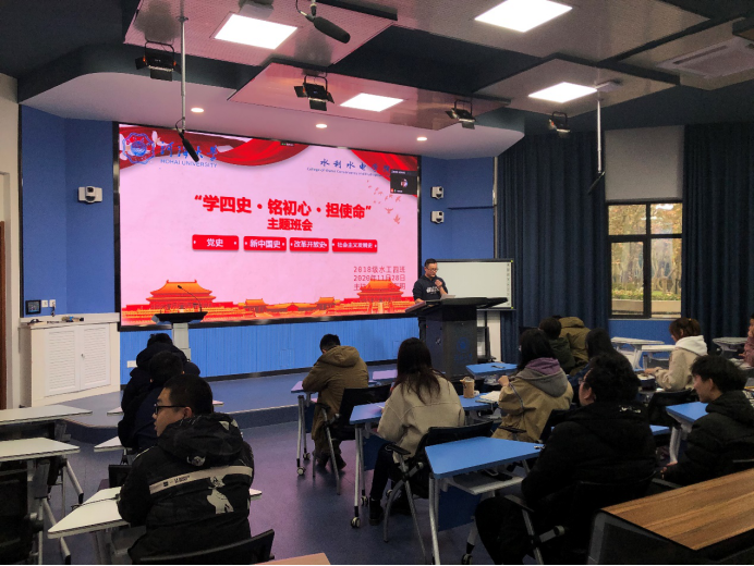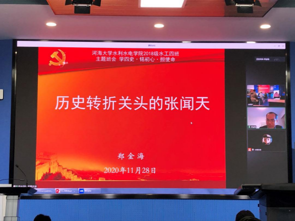 11月28日下午,水电学院2018级水工四班召开“学四史·铭初心·担使命”的主题班会。班会以线上线下相结合的形式召开,hg8868体育官网副校长郑金海在线出席班会。2018级水工四班全体同学参加班会。2018级水工四班班长李东明主持班会。