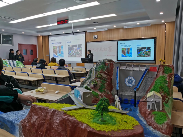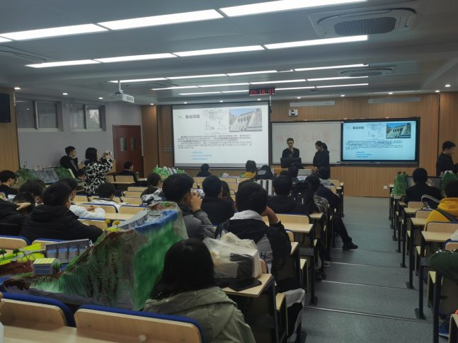 答辩于4:30在致用楼218、318、418三个教室正式展开,参赛选手按照顺序依次上台答辩,展示团队精心制作的大坝模型,讲解大坝的创新点及工作原理,一展风采。评委老师们对选手的想法产生浓厚的兴趣,答辩结束后进行了交流和沟通,同时也详细地给出自己的专业建议。