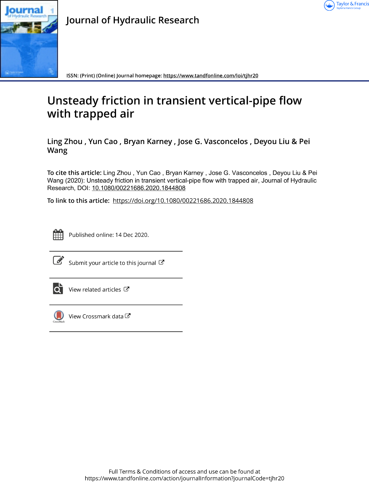 周领教授、曹云博士生、加拿大多伦多大学Bryan Karney教授、美国奥本大学Jose G. Vasconcelos教授、刘德有教授等合作完成的论文“Unsteady friction in transient vertical-pipe flow with trapped air”发表在水力学领域享有盛誉的国际顶尖期刊《Journal of Hydraulic Research-IAHR》上(https://doi.org/10.1080/00221686.2020.1844808)。研究工作得到国家自然科学基金(51679066、51839008)、霍英东教育基金(161068)等资助。