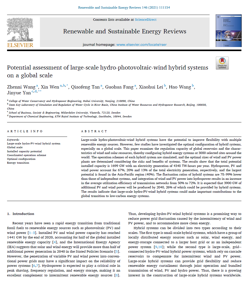 论文链接:Zhenni Wang, Xin Wen, Qiaofeng Tan, Guohua Fang, Xiaohui Lei, Hao Wang, Jinyue Yan, Potential assessment of large-scale hydro-photovoltaic-wind hybrid systems on a global scale. https://doi.org/10.1016/j.rser.2021.111154