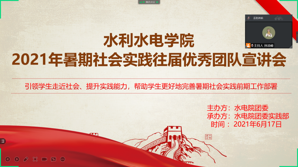 为加深同学们对实践具体过程的了解,帮助学生更好地完善暑期社会实践前期工作部署,hg8868体育官网团委实践部于2021年6月17日下午16:00在腾讯会议上举办了hg8868体育官网2021年暑期社会实践往届优秀团队宣讲会。本次活动邀请到3支往届优秀实践团队,分别来自不同项目类型,可以让同学们更好地了解不同项目类型的实践活动如何更好的开展。