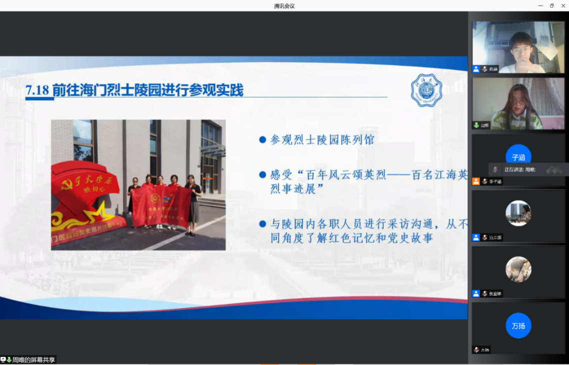 “探寻党迹,情系启海”实践团分享了团队参观启东人民首战纪念地、“八八”暴动纪念地,及前往海门烈士陵园缅怀先烈的实践经历,重走红色道路,追寻党史故事,与大家分享了在本次实践中了解到的英烈实践,表达出对先烈的敬畏之情和党史学习教育的意义。