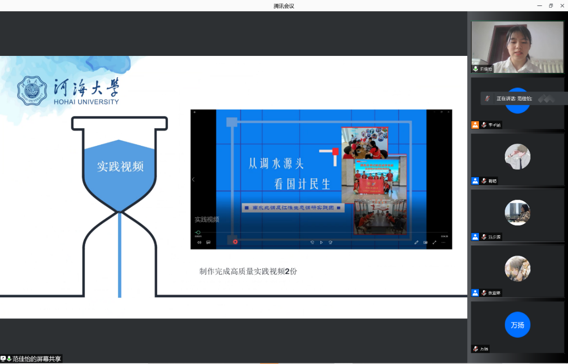 “南水北调及江淮生态调研与宣传”实践团分享了南水北调东线源头调水工程及生态文明建设的调研经历,从参观江都水利枢纽到宝应泵站基层一线调研,跟随习近平总书记的脚步看国计民生,进行专业调研,团队后期形成高质量视频2份、专业论文1篇,展示了河海水之子严谨求实、精益求精的态度和对生态文明建设的关注。