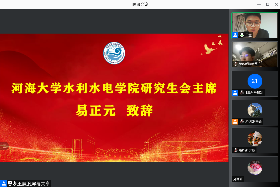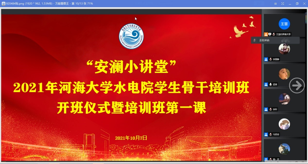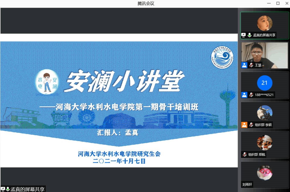 10月7日,“安澜小讲堂”——2021年hg8868体育官网水电院学生骨干培训班开班仪式暨培训班第一课在线上召开。hg8868体育官网研究生会主席团成员金子又、hg8868体育官网水电院研究生会主席易正元、副主席高阳、冯思奇及部长团成员出席本次培训,水电院第十九届研究生会全体成员及第二十四届学生会部分成员参与本次活动,活动由秘书处王慧主持。