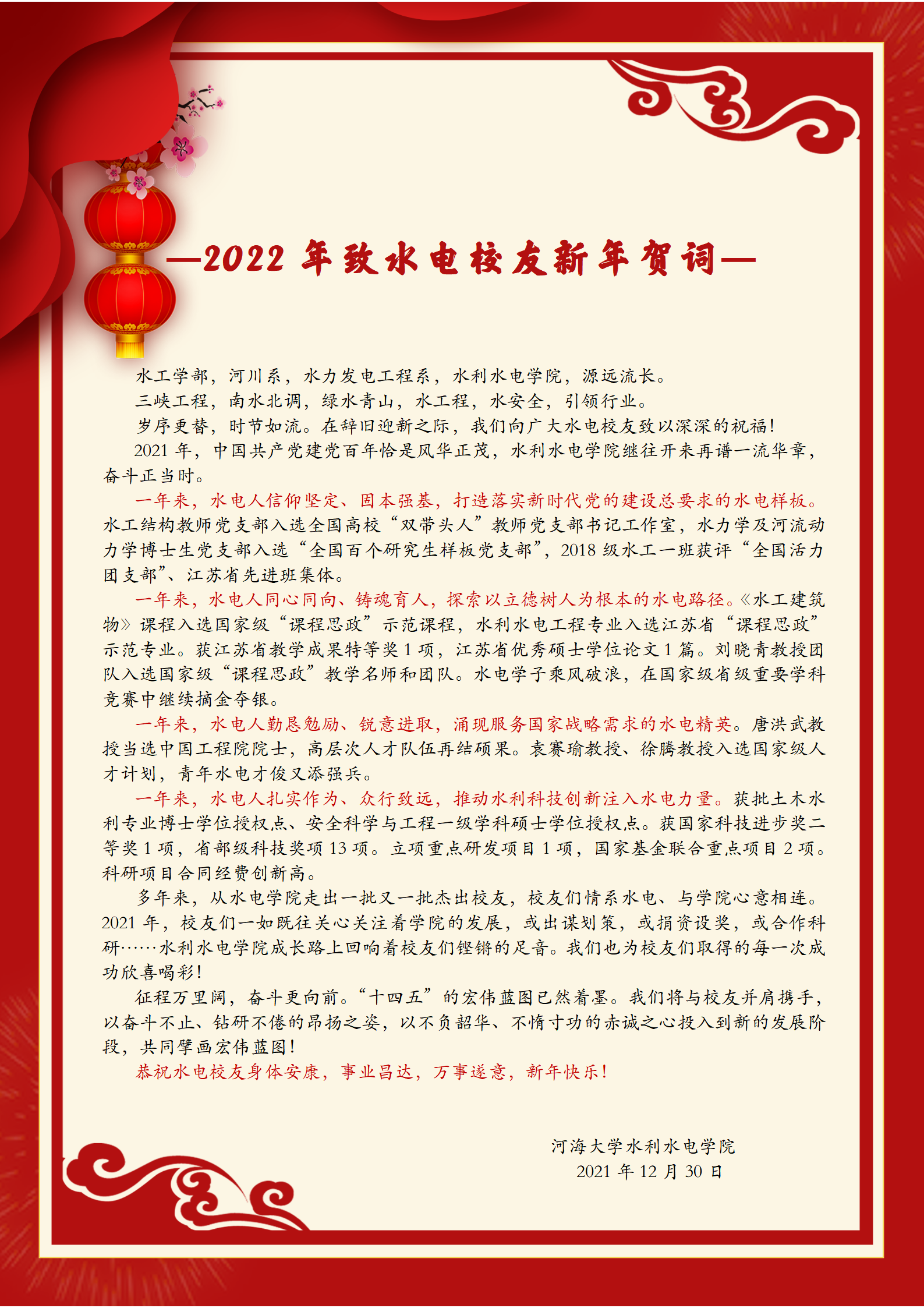 2022年致水电校友新年贺词