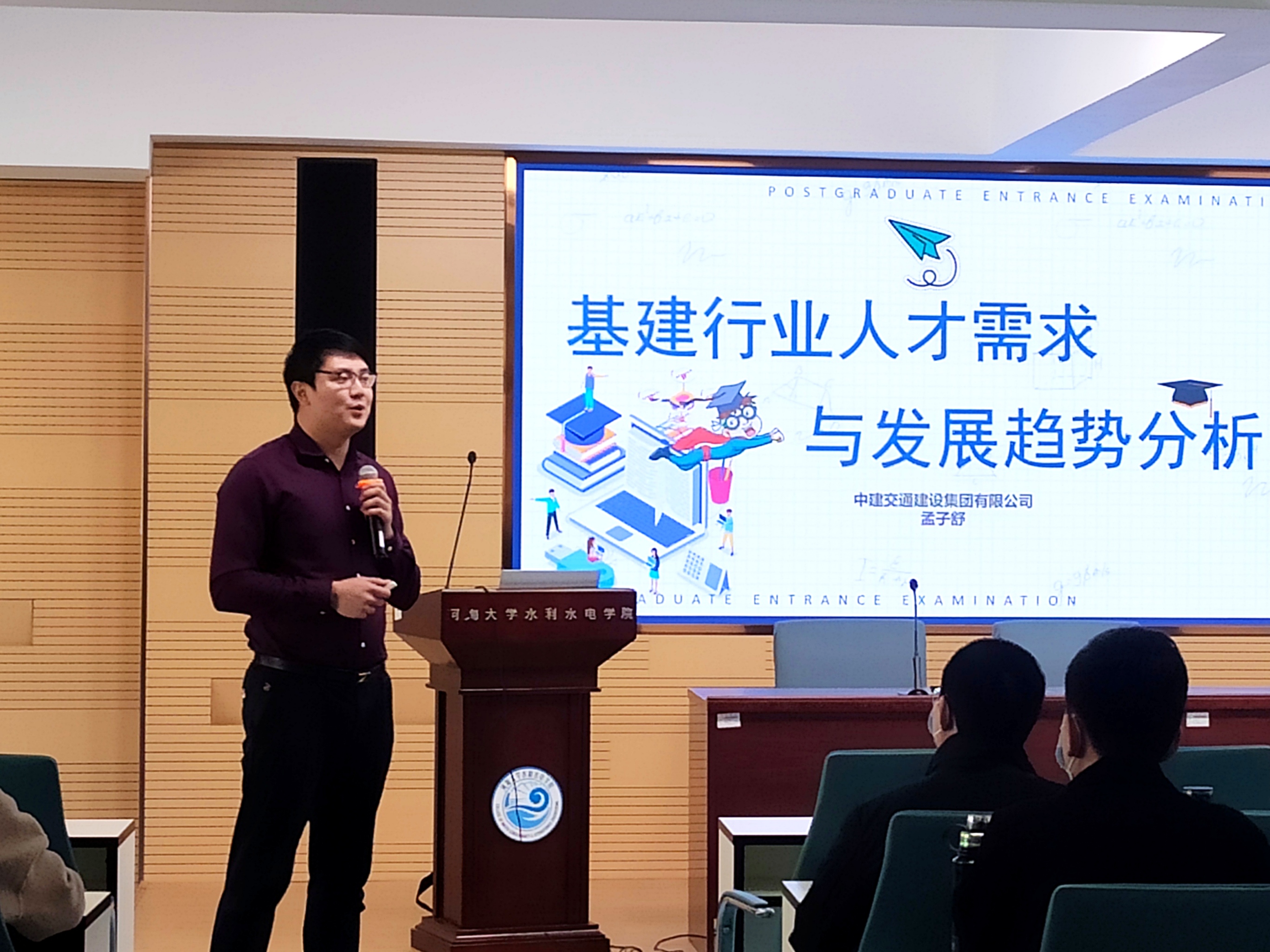 孟子舒总监的讲座围绕国内建筑行业现状与发展趋势、未来的选择、职业理想、建筑行业人才要求等四个方面展开。他详细分析了“十四五”期间,建筑行业面临的机遇与挑战,描绘了基础建设领域发展的宏伟前景,展现了大学毕业生进入建筑行业以后的成长情况。在谈到大学生职业理想时,他建议同学们从现在开始,从职位、兴趣、技能、价值、目标、平衡、工作环境、地点、薪水和其他等十大择业因素,分析各自利弊,逐渐明确自己的理想职业范围。
