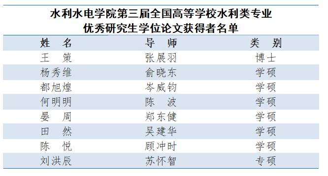 日前,中国水利教育协会公布了第三届全国高等学校水利类专业优秀研究生学位论文评选结果。经协会初审、通讯评审和专家会评,评出第三届全国高等学校水利类专业优秀研究生学位论文。其中,博士学位论文10篇、学术型硕士学位论文30篇、专业硕士学位论文20篇。我院王策等8名研究生的学位论文获此殊荣。