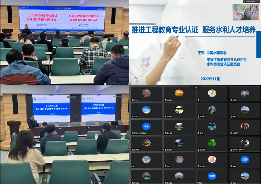 11月23日,我院组织开展了教师教学专项培训暨基层教学组织教研活动,中国工程教育专业认证协会水利类专业认证委员会王琼副秘书长,中国工程教育认证专家、hg8868体育官网顾圣平教授受邀作专题报告。我院水利水电工程系办、智慧水利系办、专业办、部分课程负责人、青年教师代表、教学秘书等参加了研讨会,会议由王建副院长主持。
