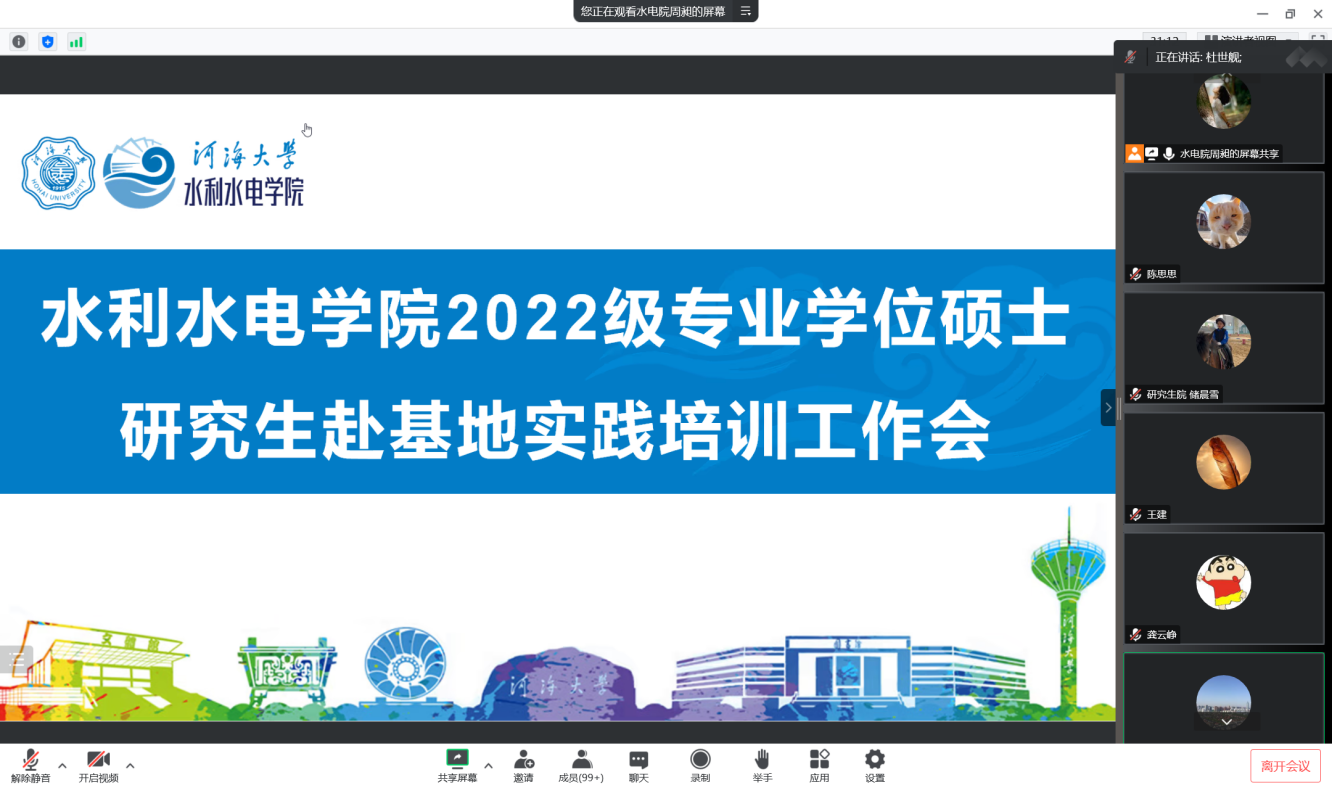 1月6日,我院召开2022级专业学位硕士研究生赴基地实践培训工作会。学校党委研究生工作部副部长、研究生基地管理办公室主任杜世舰,研究生基地管理办公室储晨雪,水电院副院长王建、党委副书记戴媛媛、教学秘书周昶、研究生辅导员陈思思及2022级全体专业硕士研究生在线上参加此次培训工作会。会议由王建副院长主持。