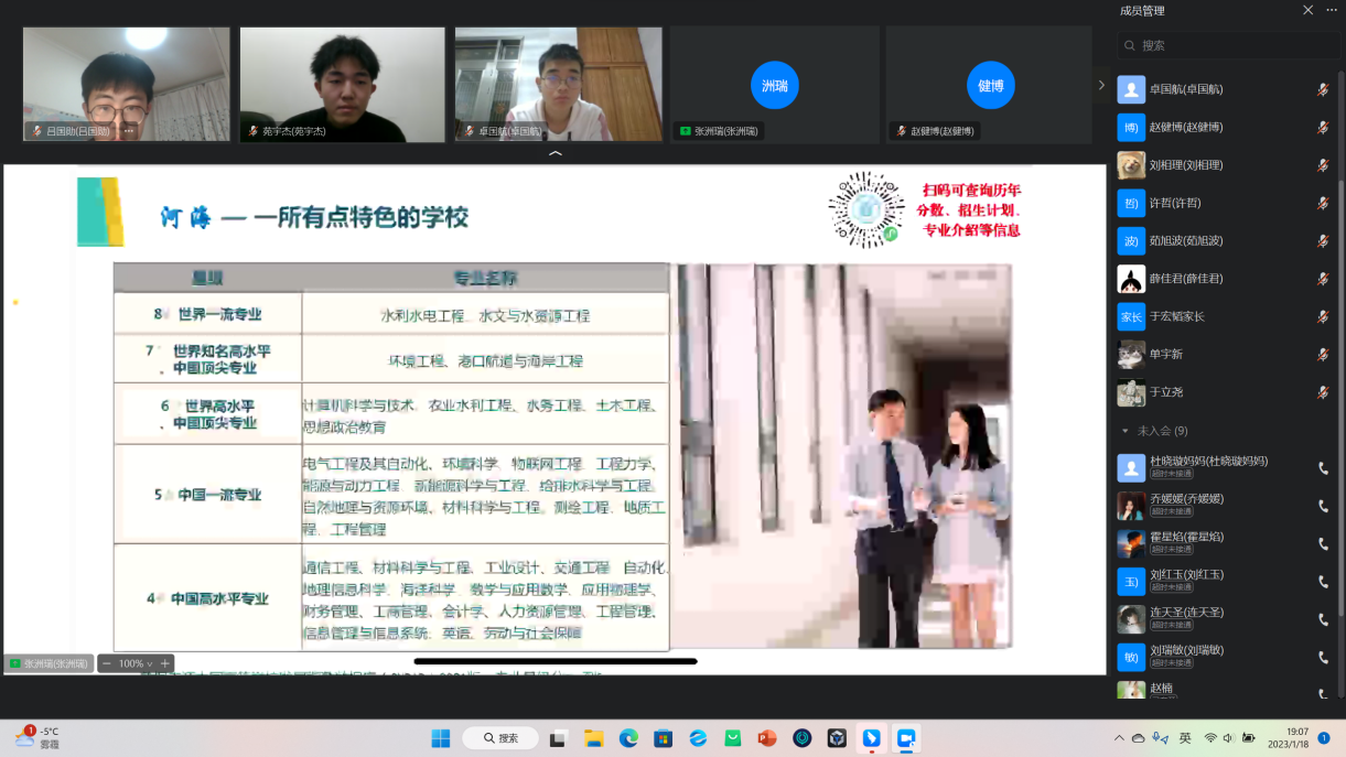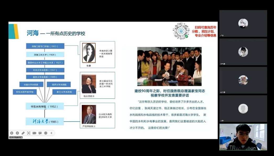 在包头市第九中学,实践团于钉钉线上网络直播平台顺利召开宣讲会。会议得到了母校的学生及家长的广泛关注,很多学生、家长在直播间聆听河海故事,了解河海文化。同时,在宣讲过程中,不少家长和同学针对自身目前情况向实践团队成员提出自己的疑虑,实践团成员都一一作出解答,并针对“专业选择”、“职业规划”、“发展方向”、“就业前景”等多个关注度较高的问题进行了更为详细的解答。宣讲活动得到了学生家长和校方的双重肯定,hg8868体育官网的水之子们真正将宣传教育落到实处。