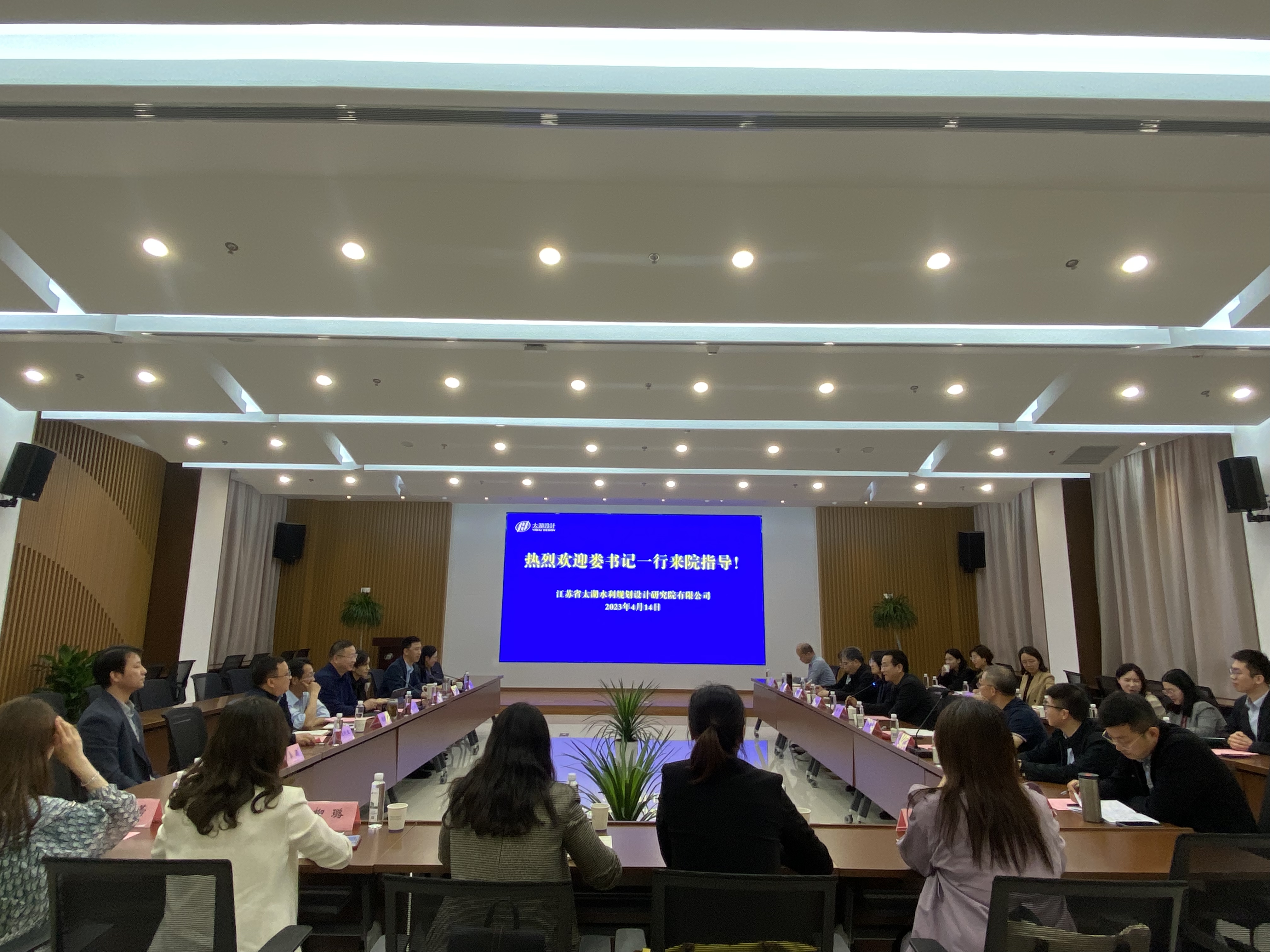 4月14日,学院赴江苏省太湖水利规划设计研究院(下文简称“太湖院”)开展访企拓岗交流活动。学院党委书记娄健、党委副书记戴媛媛带队学院研究生导师代表:水利水电工程学科方国华、周建旭,水力学及河流动力学学科傅宗甫,水工结构工程学科周兰庭,安全科学与工程学科任杰和学院工程教育与社会合作办公室主任甘磊、副主任陈胜,水力学及河流动力学研究所副所长、党支部书记闫静,水利水电实验中心副主任初文婷以及两办行政人员、辅导员共同参与。太湖院董事长展永兴、副总经理兼规划分院院长吴小靖、总工程师顾晓峰、总规划师汪院生、党委副书记兼综合管理部主任黄晓东等相关部门负责人出席座谈。