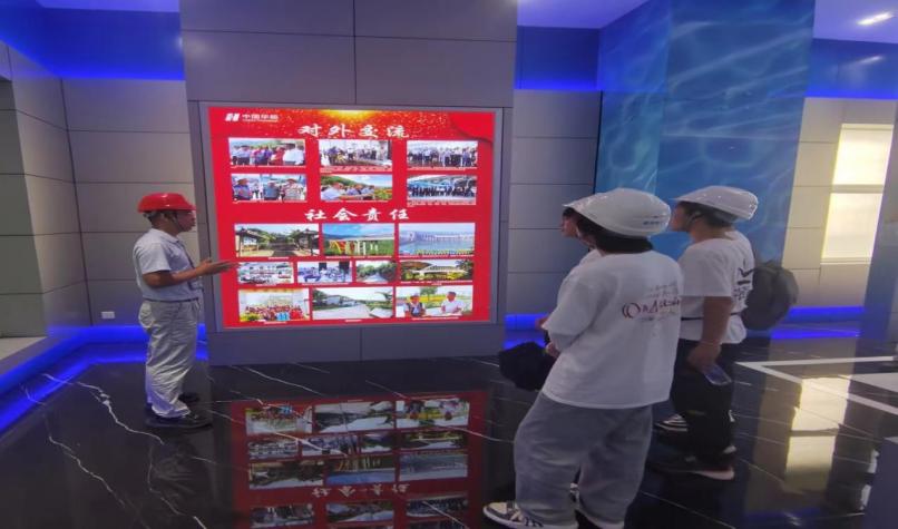 进入景洪水电站内部,校友蒋金磊向团队成员们介绍了中国华能集团有限公司、华能澜沧江水电股份有限公司及其企业文化核心理念,对近年来公司“五个一”社会责任理念(建设一座电站,带动一方经济,保护一片环境,造福一方百姓,共建一方和谐)的践行情况进行详细的说明。