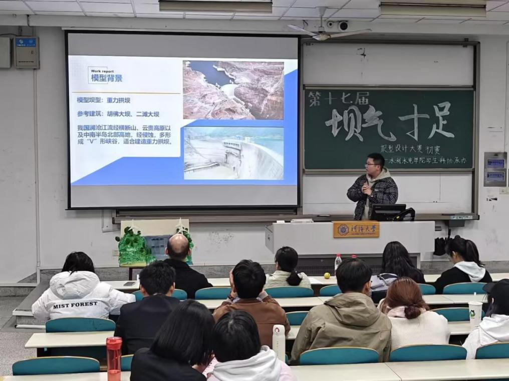 参赛团队依次上台展示精心制作的大坝实体模型,结合PPT、三维建模、动画片段,选手们生动形象地向评委和观众们展示出了作品的设计思路、创新亮点、主题寓意等信息。现场展示出制作精巧的重力坝、实用简约的支墩坝等,详细展示了作用各异的节制闸、冲沙闸、升船机、鱼道等,并在坝型外观和美工上融入中华传统元素,带来专业知识与艺术美学的双重享受,体现了水之子传承接续前辈力量建设国家水利事业的决心。