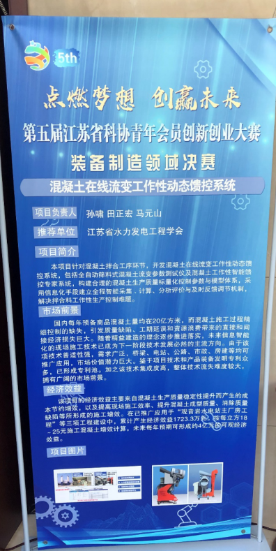 The equipment manufacturing final of the 5th Jiangsu Association for Science and Technology Youth Member Innovation and Entrepreneurship Competition was held in the Academic Lecture Hall of Tianyin Conference Center, Nanjing Institute of Technology on Nov 14th. The team project of Sun Xiao, Tian Zhenghong and Ma Yuanshan, "Dynamic feedback control system for on-line rheological workability of concrete", was recommended by the Jiangsu Society of Hydroelectric Engineering and won the Excellence Award in the Innovation Group in the Equipment Manufacturing Field.